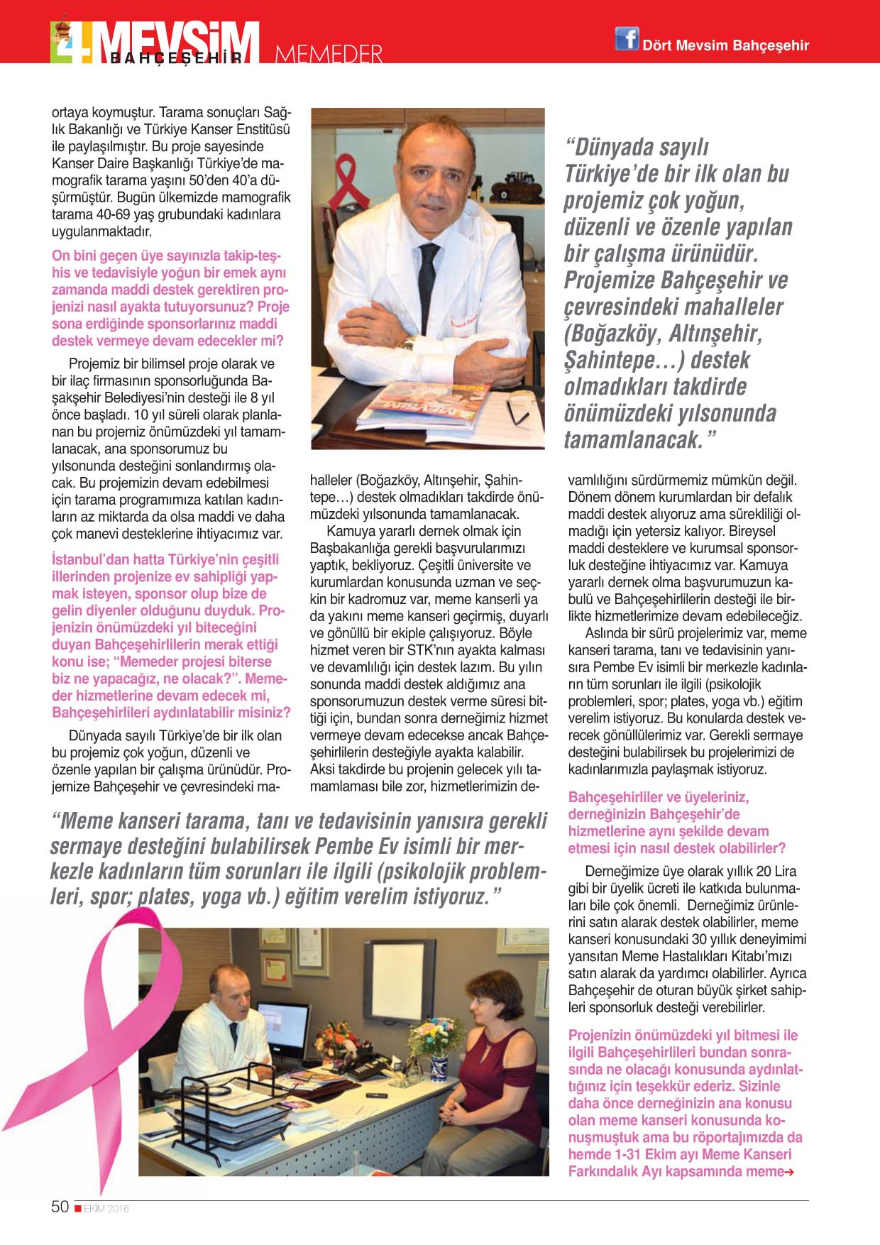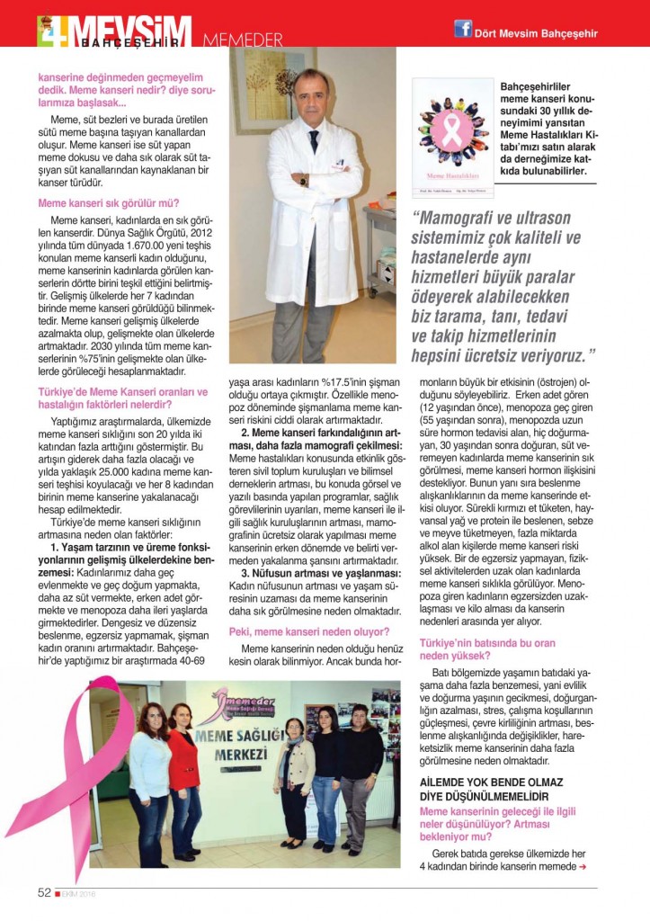 Bahçeşehir’de 105 Kadını Meme Kanserinden Kurtardık Prof. Dr. Vahit Özmen’in 4 Mevsim Bahçeşehir dergisi Ekim 2016 röportajı.